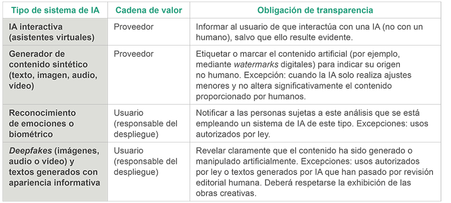 Este artículo establece varias obligaciones de transparencia para los proveedores y usuarios (responsables del despliegue) de cuatro categorías de sistemas de IA: